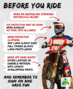The total number of riders on the property or each track may be limited if unfavourable hot weather or dusty conditions persists on any given Ride Day. On busy days rider numbers will be restricted on each track and session times can be altered by officials at short notice for safety reasons.