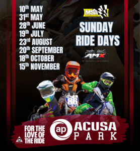 ACUSA Park is an off-road motorcycle ride park at Harrogate in the Adelaide Hills, incorporating two Natural Terrain Motocross tracks, a Trail Loop and a Junior Beginners Area, available on scheduled Ride Days for anyone with a safe and ride-worthy motorcycle.